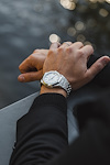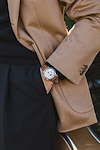 En elegant kronograf, stålboett möter en varm, silvervit tavla med diskret dag och datumvisning. Enkelheten är dess styrka – en klocka som bärs med självklarhet snarare än att göra väsen av sig.